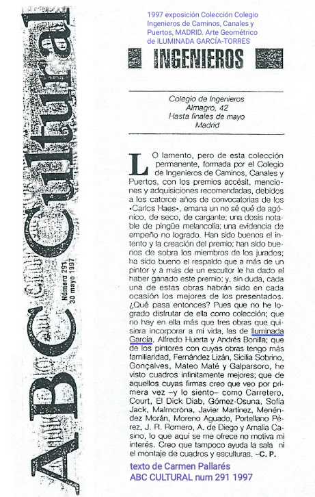https://ILUMINADA-GARCIA- TORRES-concursos-Premio- Pintura-L'OREAL-X-XI-centro- cultural-CONDE-DUQUE-MADRID- 1994-1995 1996· 2ºPremio Pintura, geometría de ILUMINADA GARCIA-TORRES. catálogo Colección Artes Plásticas 1982-1996 del Colegio Ingenieros de Caminos, Canales y Puertos, Madrid iluminadagarciatorres. blogspot.com